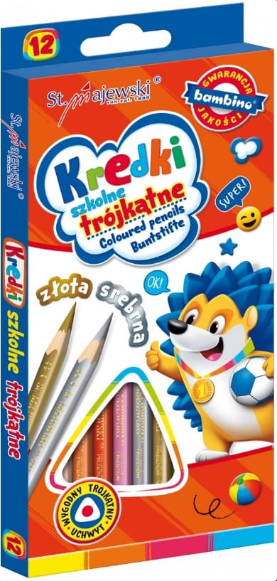W opakowaniu znajduje się 12 kolorowych kredek o długości 18 cm. Szczególną uwagę warto zwrócić na dwa kolory – złoty i srebrny, które są nowością. Kredki cechują się żywymi i wesołymi kolorami. Opakowanie zdobione jest kolorowymi wzorami z serii Bambino. Kredki wyróżnia bardzo wysoka jakość produkcji. Dzięki temu nie łamią się, nie kruszą i nie brudzą. Trójkątny kształt kredki sprawia, że bardzo dobrze układa się w rączce każdego dziecka.