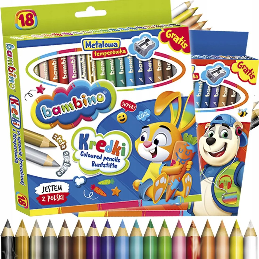 Kredki 18 kolorów oprawa drewniana + temperówka Bambino
