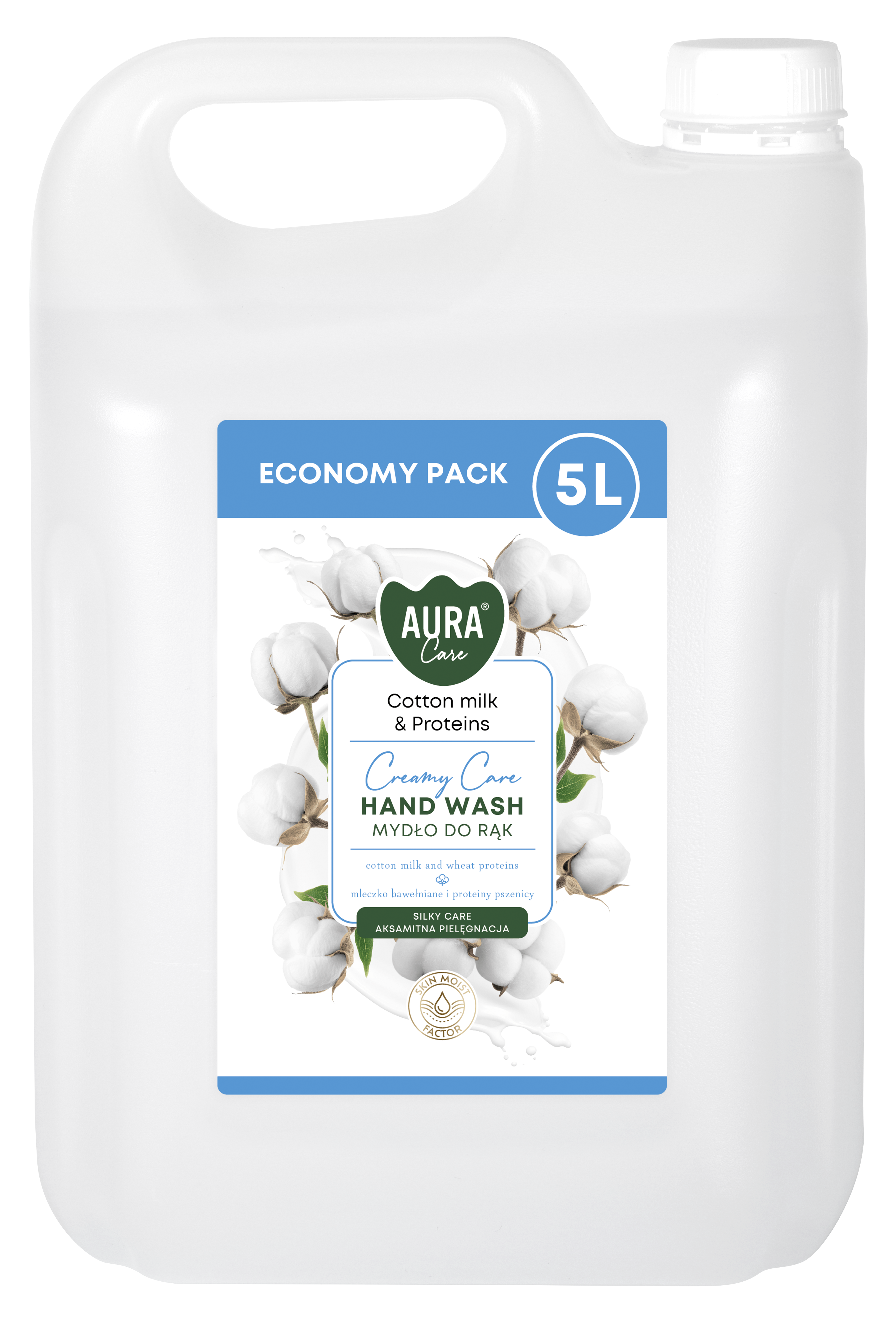 Mydło uzupełniające Mleczko bawełniane i Proteiny Aura Care w dużym opakowaniu 5 L, łączy wydajność z wyjątkową pielęgnacją. Kremowa formuła wzbogacona o glicerynę i kompleks nawilżający zapewnia skórze odczucie nawilżenia, a zawarte w składzie mleczko bawełniane oraz proteiny pszenicy sprawiają, że skóra po umyciu pozostaje miękka i wygładzona.
