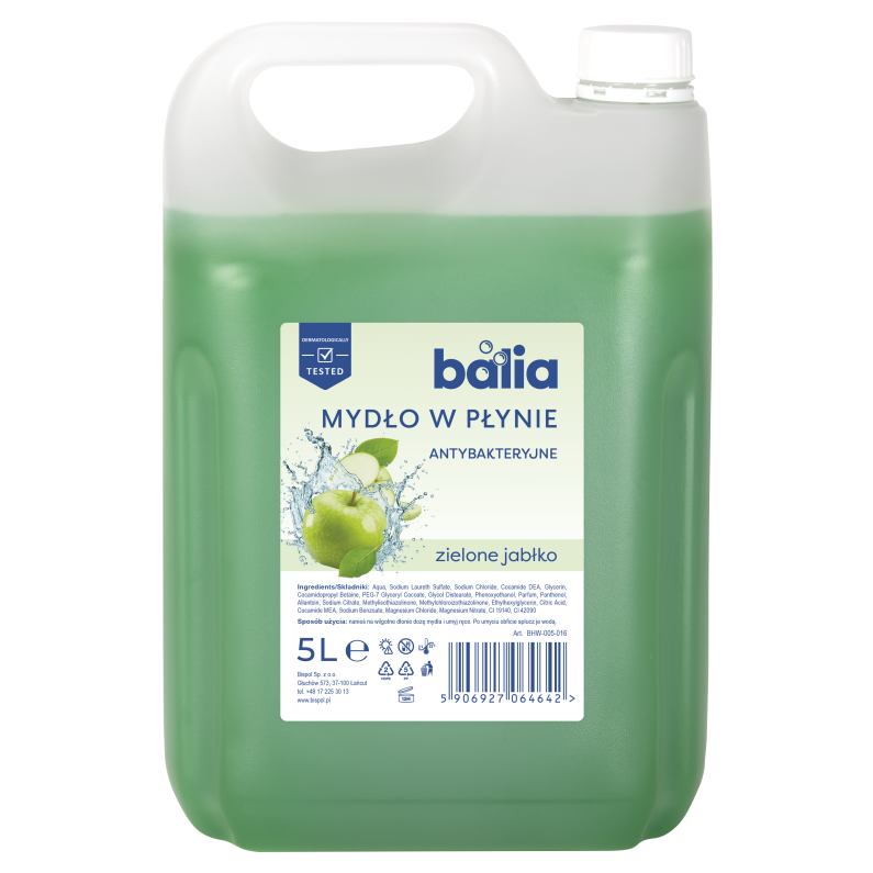 Mydło do rąk Balia Zielone Jabłko 5 L to wydajne i ekonomiczne mydło w płynie do rąk, przeznaczone do codziennego stosowania w firmach, instytucjach publicznych oraz zakładach przemysłowych. Produkt skutecznie oczyszcza dłonie i wykazuje działanie antybakteryjne. Formuła zawiera glicerynę, pantenol i alantoinę – składniki znane z właściwości pielęgnujących, które pomagają ograniczać uczucie przesuszenia i wspierają komfort skóry podczas częstego mycia rąk. Orzeźwiający zapach zielonego jabłka nadaje uczucie świeżości i czystości po każdym użyciu. Duża pojemność 5 litrów czyni produkt idealnym rozwiązaniem do uzupełniania dozowników w toaletach i strefach sanitarnych.