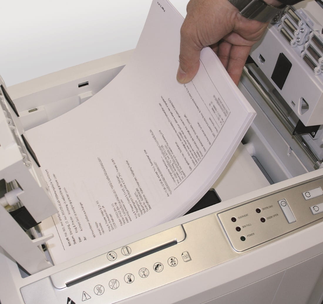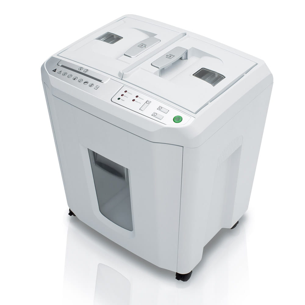 | Dodatkowe cechy niszczarki: | fotokomórka, automatyczne zatrzymanie w przypadku przepełnienia kosza na ścinki, osobny pojemnik na płyty CD/DVD/Blue-Ray, mechanizm wahadłowy dla równomiernego ułożenia ścinek na całej powierzchni kosza eliminujący tworzenie się tzw. zatorów stożkowych |