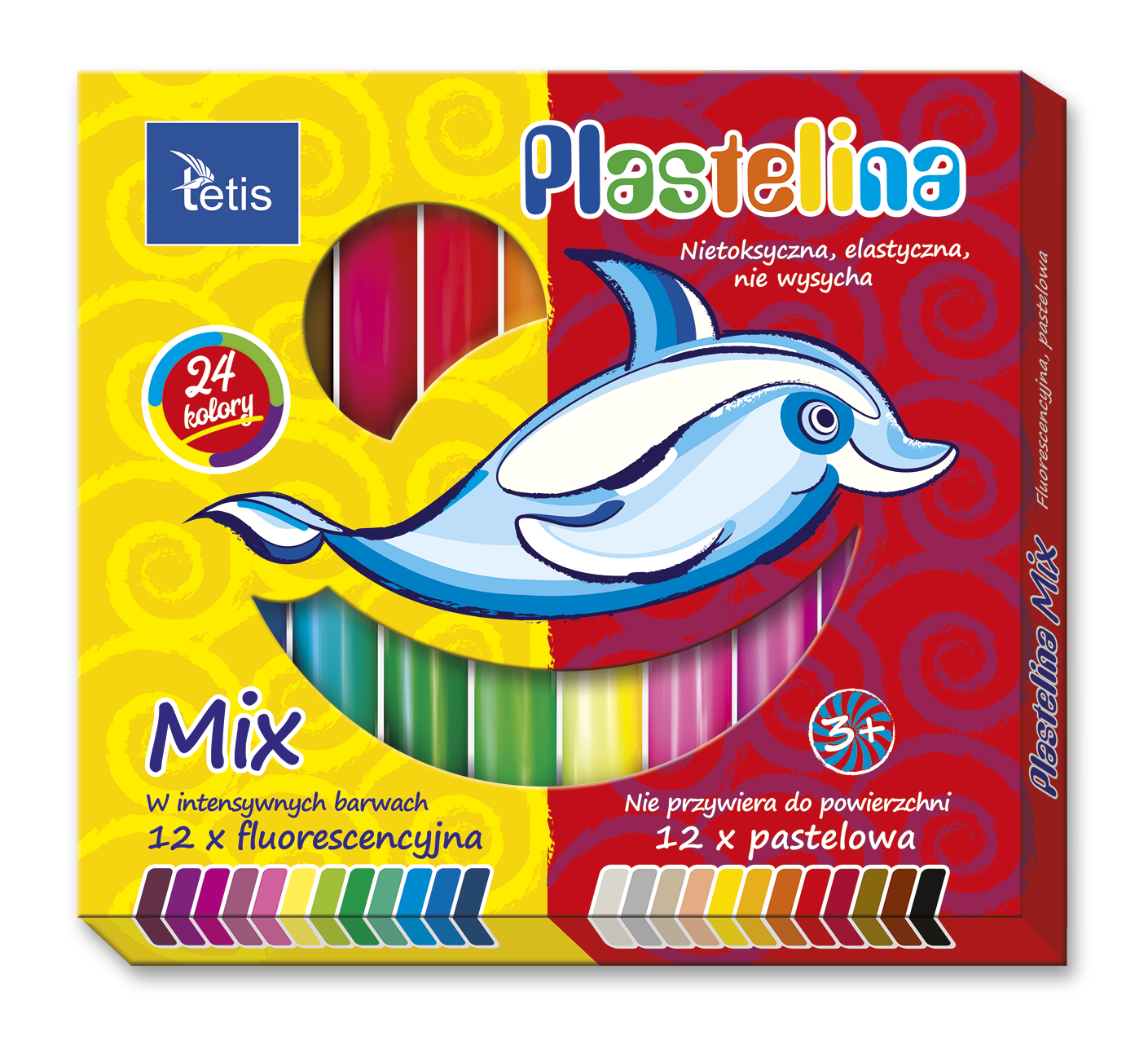 Plastelina pastelowa (12 kolorów) i fluorescencyjna (12 kolorów). Elastyczna. Nietoksyczna. Nie wysycha, nie przywiera do powierzchni, nie brudzi rąk.
